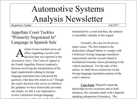 Dealers receive the benefit of quarterly Newsletters aimed at addressing regulatory trends, civil litigation developments and/or legislative changes confronting the industry. We use our Newsletters to keep dealers up to date on critical changes, trends and/or developments allowing the dealer to take corrective action before these issues can affect your dealership.